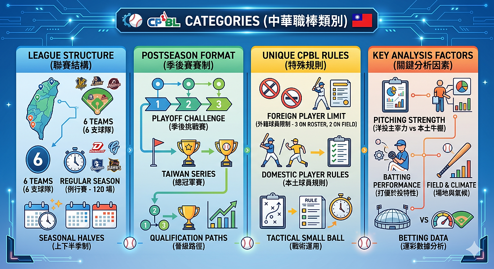 認識中華職棒(CPBL)是台灣運彩玩家最親切、也最具資訊優勢的賽場。身為在地職業聯賽,中職以打擊見長,賽事過程極具張力與話題性。