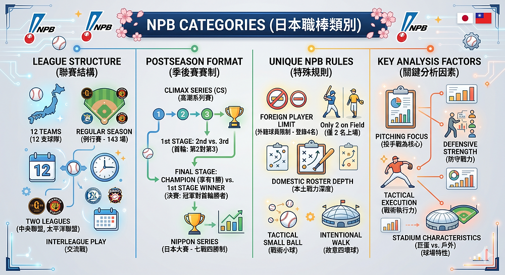 認識日本職棒 NPB(Nippon Professional Baseball)是體育投注中公認最細膩、數據規律性最強的賽場。日職以精準控球、戰術小球與極致防守著稱,與美職 MLB 的強力棒球風格截然不同。